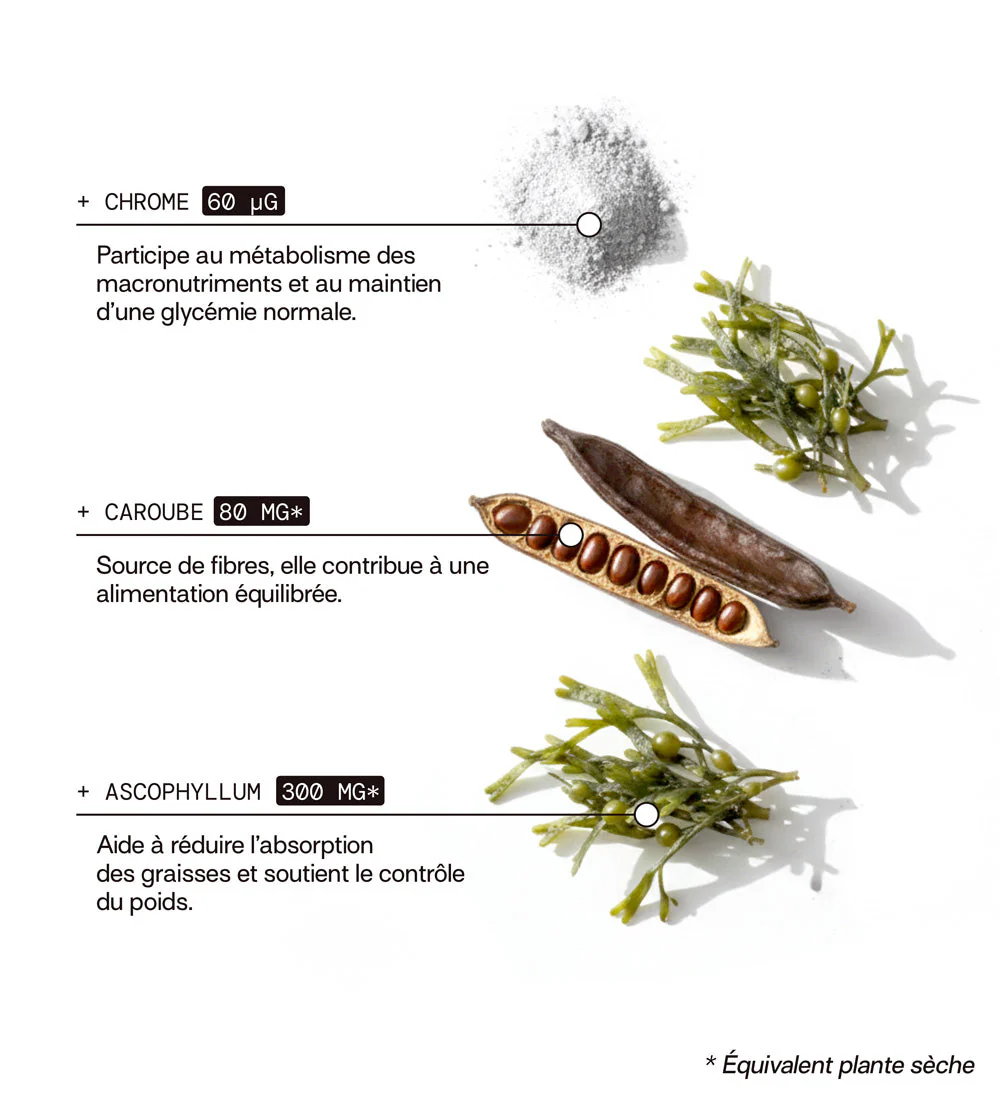 En combinant des fibres, des extraits marins et du chrome, ils aident à mieux ressentir la satiété, à éviter les pics glycémiques et à retrouver un rapport plus apaisé à l’alimentation, sans frustration ni effet coupe-faim brutal.